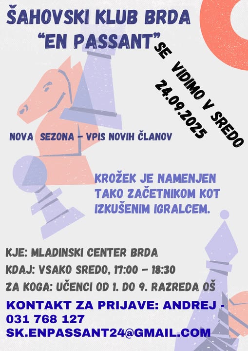 Z veseljem vam sporočamo, da bo šahovski klub Brda “En Passant” tudi letos nadaljeval s šahovskim krožkom!